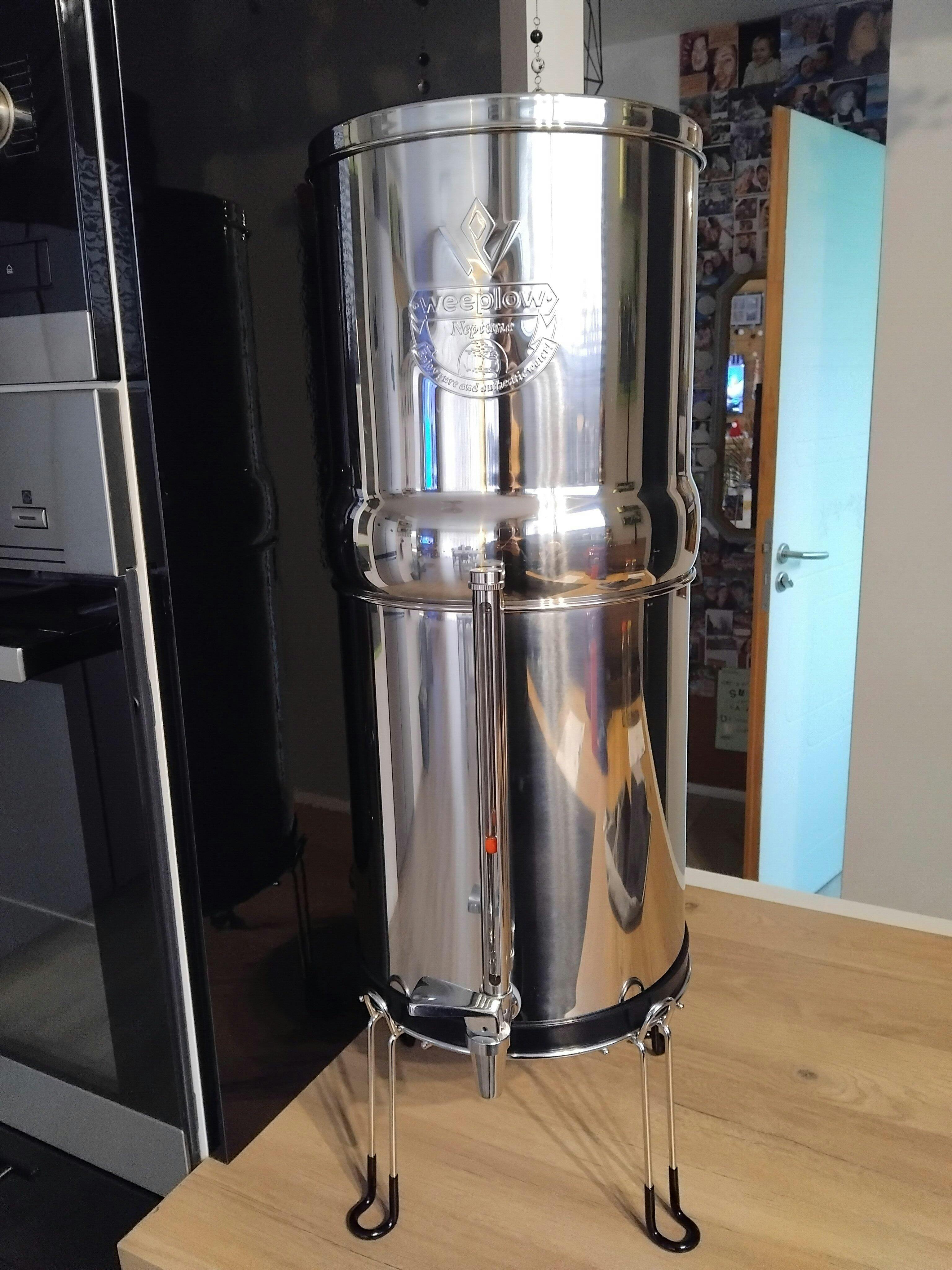 | Model | Neptune | Color | Silver | Material | AISI 304 stainless steel | Capacity | 11 Liters | Power Type | Non-Electric | Filtration flow (with 2 filters) | 3.8 Liters per hour | System height (without support) | 56 centimeters | System height (with support) | 72 centimeters | System diameter | 24 centimeters | Weight of the complete system | 4.8 Kg |