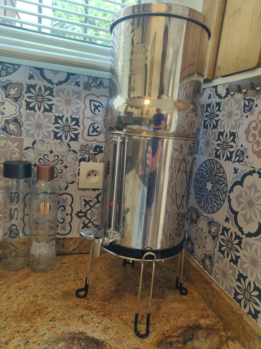 | Model | Earth | Color | Silver | Material | AISI 304 stainless steel | Capacity | 8.5 Liters | Power Type | Non-Electric | Filtration flow (with 2 filters) | 3.8 Liters per hour | System height (without support) | 50 centimeters | System height (with support) | 66 centimeters | System diameter | 22 centimeters | Weight of the complete system | 4.2 Kg |